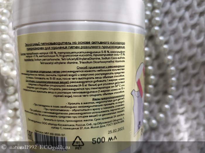 Так же хочу отдельно отметить гипоаллергенность продукта. Так как состав у пятновыводителя полностью натуральный, я использовала его для выведения пятен с детских младенческих вещей. Хотя у нас склонность кожи к атопическому дерматиту. Никакой негативной реакции у нас после стирки вещей этим средством, на коже не было. Продукт не вызвал раздражения, зуда или обострения. Так что и для деток он тоже вполне подходит. Мамам на заметку.