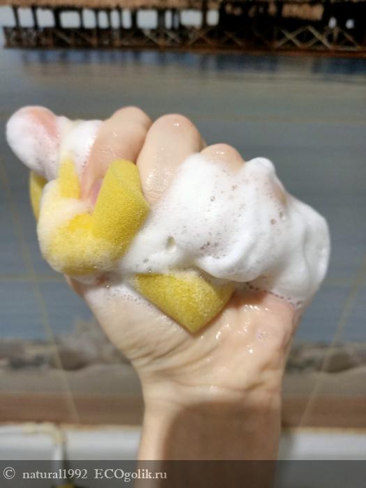 Пену удалось сфотографировать только на губке, но и в руках оно тоже отлично пенится