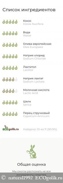 Омыленные масла: оливковое (90% от массы масел), кокосовое (10% от массы омыленных масел), вода, оливковое масло, реликтовая соль (5%), лактитол 3% (натуральный пребиотик из молочного сахара), компоненты натурального увлажняющего фактора кожи (лактат натрия, молочная кислота) 5%, лицин 2% (основная аминокислота шелка), натуральный пищевой ароматизатор, экстракт паприки.