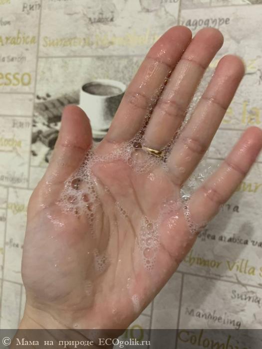Пенится мыло отлично. Кокосульфат и кокоглюкозид делают свое дело и пенообразование происходит сразуже. Пены много. Для мытья рук ее хватает сполна. Думаю и для мытья посуды ее хватит спокойно. Кожу рук мыло не сушит, никакой сухости или стянутости нет. Крем для рук после мытья не требуется.