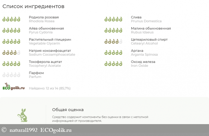 - Mare Salis (Dead Sea Salt) (соль Мертвого моря), Rubus Idaeus (Raspberries) Seed Extract (экстракт малины), Rhodiola Rosea Extract (экстракт родиолы розовой), Prunus Domestica (Plum) Extract (экстракт сливы), Prunus Armeniaca (Apricot) Extract (экстракт абрикоса), Pyrus Cydonia (Quince) Extract (эктракт айвы), Rubus Idaeus (Raspberries) Seed (семена малины), Vegetable Glycerin, Сetearyl Alcohol, Sodium Cocoamphoacetate, Argania Spinosa Oil (масло арганы), Tocopherol (витамин Е), CI 77491 (Iron Oxide) (натуральный пигмент оксид железа), Parfum.