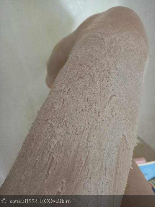 Я наношу продукт обильно, не жалея. Особое внимание уделяю именно проблемным зонам, где есть небольшое количество целлюлита. Смывается скраб очень легко и быстро, не скатывается в процессе смывания. Я смываю обычной теплой водой, в том числе и мягкой за городом. Скраб полностью заменяет мне гель для душа или например бельди.