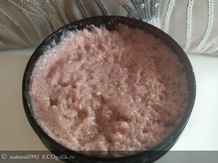 Текстура у скраба очень мягкая и нежная. Сразу понимаешь, что скраб в действии будет деликатен и не агрессивен. Если для кожи лица я преподчитаю более грубые и жесткие скрабы, то для кожи тела мне нравятся различные, в том числе и мягкие. Частички очень мелкие, их даже трудно заметить с первого взгляда. Текстура у скраба мягкая, тянущаяся и кашеобразная.
