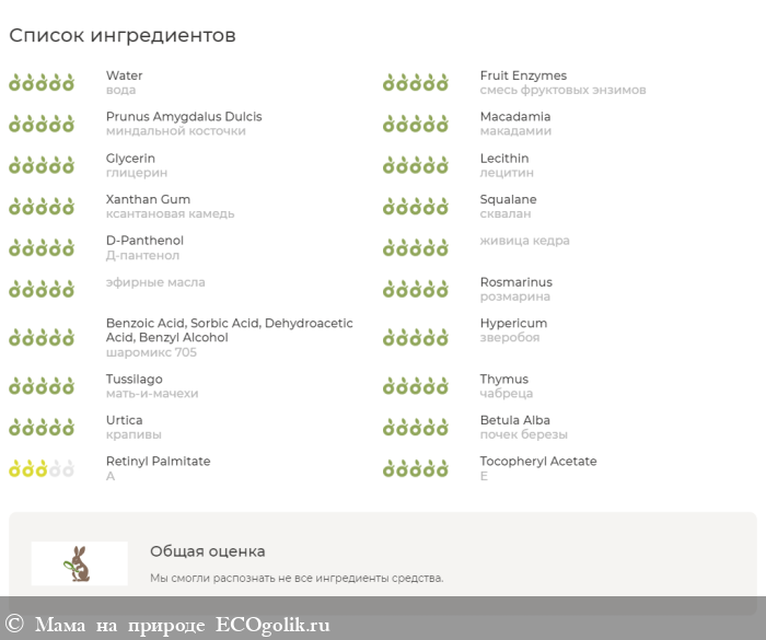 вода, смесь фруктовых энзимов, экстрагированных из мякоти плодов черимойи, масла: миндальной косточки, макадамии; глицерин, лецитин, ксантановая камедь, сквалан, Д-пантенол, живица кедра, эфирные масла: розмарина и кайепута; шаромикс 705, экстракты: зверобоя, мать-и-мачехи, чабреца, крапивы и почек березы; витамины: А,Е.