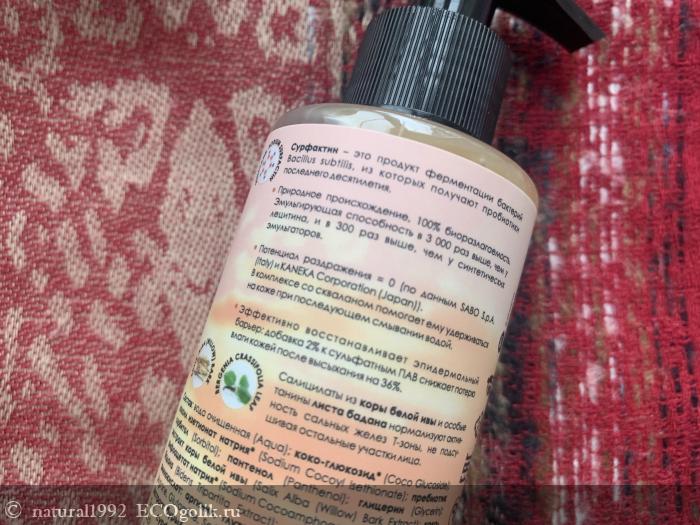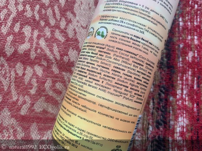 Состав представлен на обратной стороне флакона. Он без сульфатов, основу составляет мягкий пав коко глюкозид. Моя кожа хорошо реагирует на него, при этом он хорошо пенится. Сервис проверки никаких опасных компонентов в нем не нашел. Полный подробный обзор можно посмотреть тут