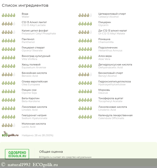 Тут все отлично. Эта марка одна из моих самых любимых за детской кожей и я ей давно уже полностью доверяю. И знаю что составы их всегда безопасны для детской кожи, с очень низком риском аллергической реакции. Сервис проверки распознал и одобрил все компоненты в составе молочка. Подтвердил мои слова. Силиконов, красителей, ароматизаторов и консервантов искусственного происхождения там нет. Все растительное и разрешенное.