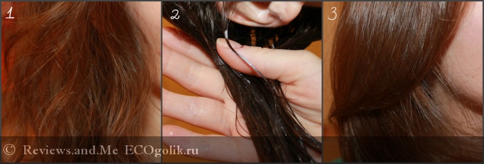 Я наносила бальзам на чистые мокрые чуть подсушенные полотенцем волосы и оставляла минуты на 2-5, а иногда, если использовала бальзам в выходной, оставляла минут на 10-15. Он отлично распределяется по волосам, не течет, и хорошо смывается. Волосы буквально струятся под водой во время смывания. Сухие волосы хорошо расчесываются после бальзама, становятся легкими, шелковистыми и чуть боле блестящими. Мои тонкие волосы бальзам хорошо питает, поэтому я использовала его не более 2-3 раз в неделю в качестве маски. Фото 1 - волосы до мытья, днем раньше накручивала на папильотки, поэтому немного волнистые и чуть пушатся. Фото 2 - наношу бальзам. Фото 3 - результат, чистые волосы. Фотографировала все при искусственном освещении.
