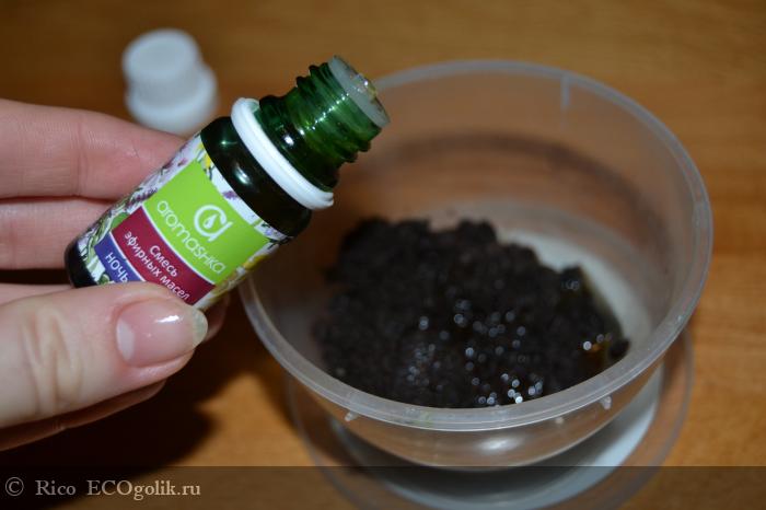 3. Обогащение уходовых средств. Данная смесь, мне кажется, будет очень круто звучать и затем раскрываться, если обогатить ею готовый натуральный нейтральный крем. Но я добавляла её в самодельный скраб для тела - измельченные кофейные зерна, сахар, базовое масло и пару капель смеси "Ночь любви". Аромат заполняет собой всю ванную комнату и очень расслабляет!