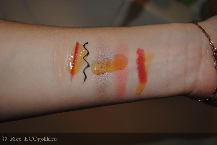 Вернемся к маслу от Take Care Studio. Для начала предлагаю оценить способность масла растворять косметику и очищать кожу от макияжа. На руку нанесены средства. которые я использую практически каждый день: консилер, карандаш для губ, подводка, тени, румяна и помада.