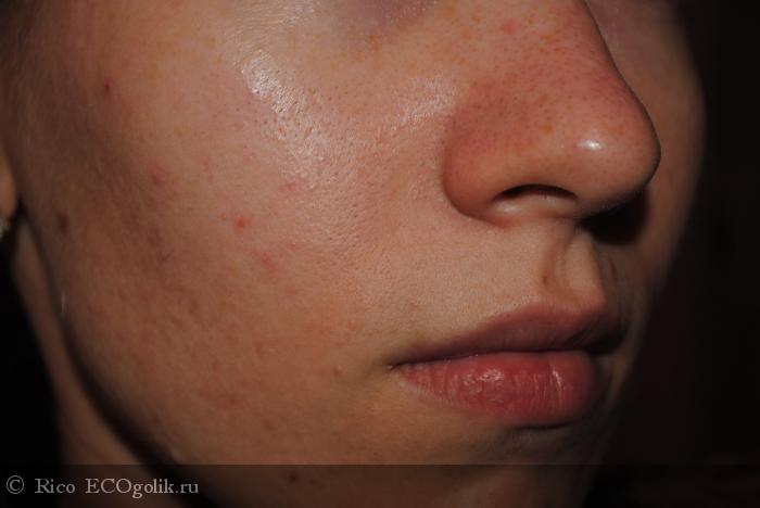 На лице это выглядит следующим образом. Кожа "до" с тональным кремом, под конец дня, присутствует жирный блеск: