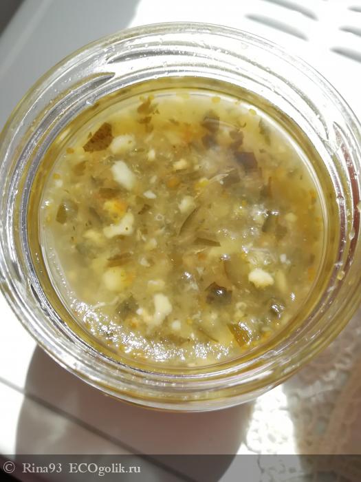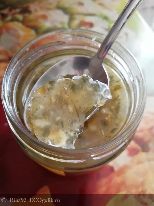 : зеленые кусочки то ли петрушки, то ли другой зелени, оранжево-желтые походили на морковь. А за счет агара в составе, плотной именно желеобразной консистенции ассоциации с холодцом так и не покидали меня