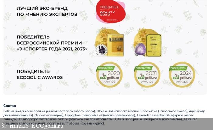 Мыло приятно и не очень ярко пахнет, дарит бережное очищение и увлажнение. Обладая также антибактериальным эффектом, оно отличается гипоаллергенностью и имеет пометку Vegan.
