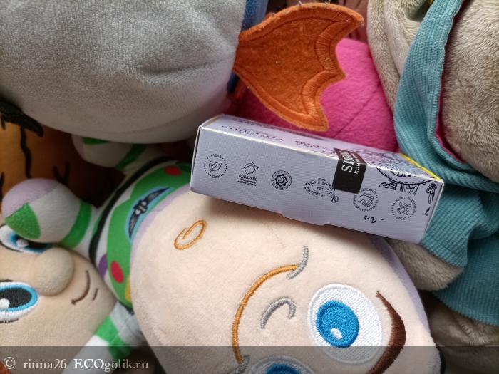 На двойной упаковке есть защита от вскрытия. Мыло желтоватое, но белого цвета с фирменным знаком. Оно не тестируется на животных подходит для ежедневного применения. Эко-товар можно использовать для рук, тела и лица с 3 лет.