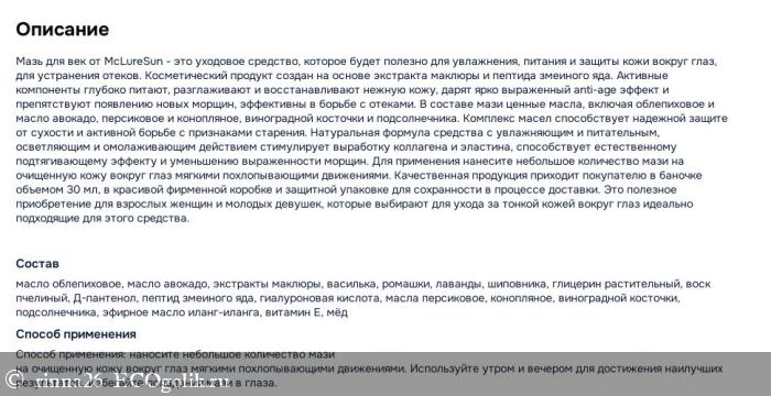 Мазь не липнет и не склеивает, а также отлично подходит для нежной кожи вокруг глаз.