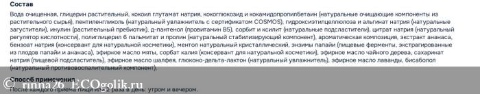 В составе зубной пасты отсутствуют диоксид кремния, карбонат кальция и прочие абразивные компоненты, при производстве используются мягкие ПАВ, энзимы папайи и ананаса, которые обеспечивают мягкое отбеливание.