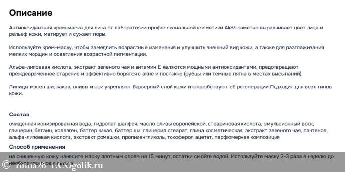 Антиоксидантная крем-маска от профессиональной косметики AleVi выравнивает тон и рельеф кожи, матирует и сужает поры, замедляет возрастные изменения и улучшает внешний вид кожи, а также осветляет пигментацию.
