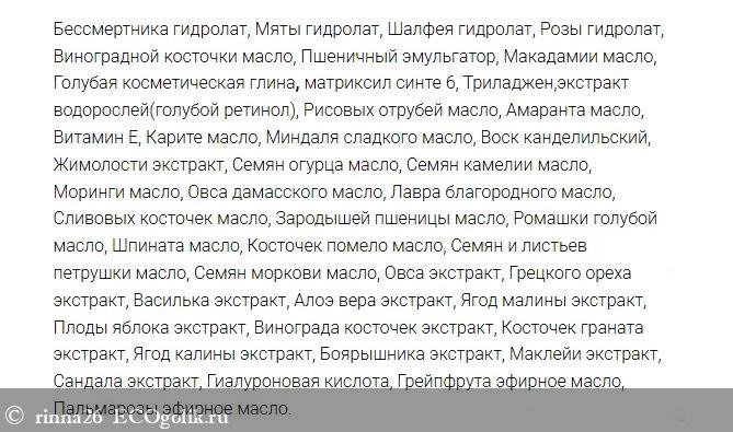 - ·Масло виноградной косточки, голубая косметическая глина, масло моринги, масло сладкого миндаля, гиалуроновая кислота и много всего полезного и интересного.
