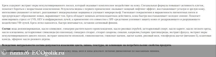 Сам крем содержит знакомые ингредиенты и экстракт икры некультивированного лосося, которые показывают комплексное действие, и помогают бороться с возрастными изменениями.
