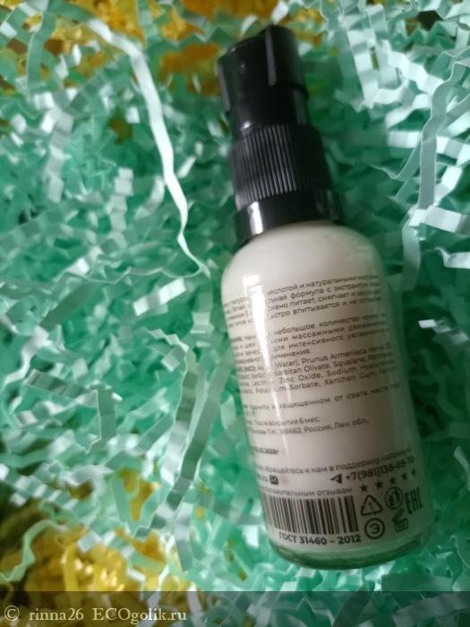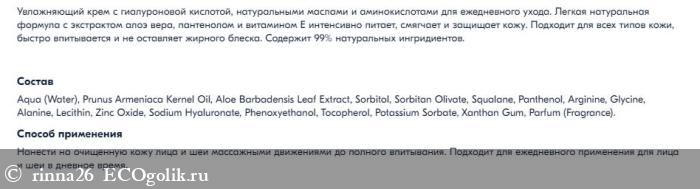 Увлажняющий крем с гиалуроновой кислотой и полезными натуральными компонентами был доставлен в бумажной упаковке со скотчем и наклейками. Он не содержит красителей и парабенов, спирта и формальдегида, имеет традиционный объем и рабочий дозатор, является гипоаллергенным средством с натуральными ингредиентами. Крем подходит для ежедневного использования и проверен дерматологами. Считаясь эко-товаром, он прекрасно расходится по коже, имеет экономный расход, быстро впитывается, не оставляет эффекта плёнки и жирности, отлично увлажняет и питает кожу. При этом он очень нежный и не липкий! Крем имеет лёгкую текстуру и сильный, натуральный состав. Он пахнет миндалем и не оставляет жирного блеска.