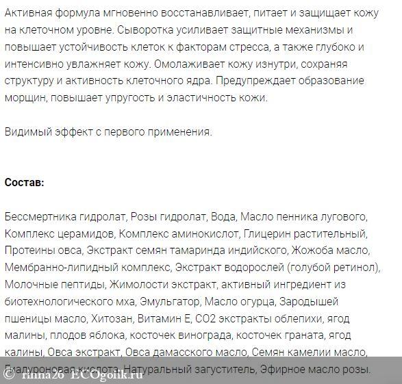 Текстура у сыворотки нежная и легкая. Напоминает флюид. Цвет белый, походит на крем. Аромат натуральный и растительный. Сыворотка отлично увлажняет и питает кожу, дарит чувство комфорта и ее может использоваться без крема. Не вызывает чувства плёнки, сухости или неприятных ощущений. Кроме того, сыворотка быстро впитывается и оставляет кожу матовой и напитанной. Хранить ее нужно в холодильнике. И это единственная неприятность. Хотя как посмотреть)))