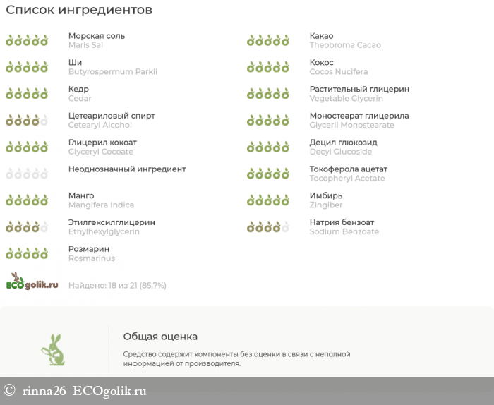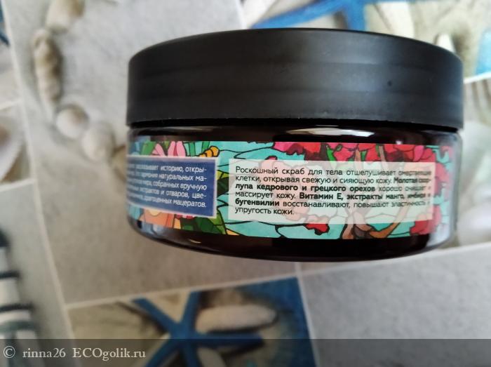 Достаточно яркий, интенсивный, вкусный, но не навязчивый аромат очаровывает нотками сладкого спелого манго, пикантного имбиря и экзотических цветов. За отшелушивание отвечает не толь соль, но и молотая скорлупа грецкого и кедрового ореха.