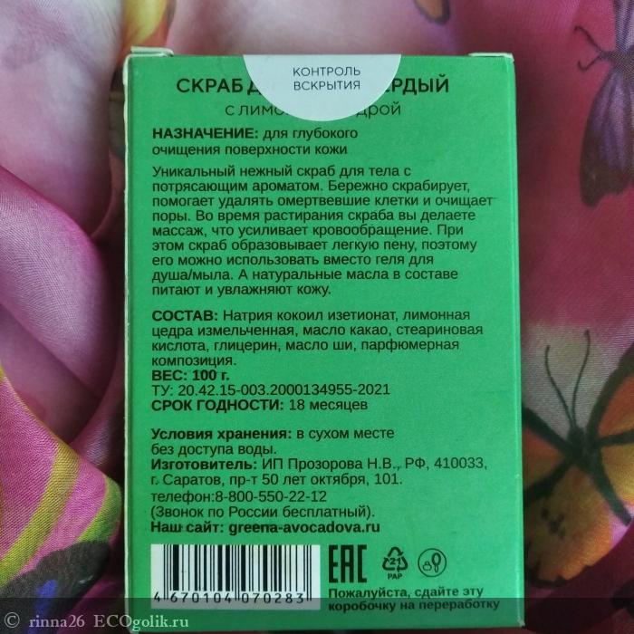 Скраб для тела с лимонной цедрой от Greena Avocadova мне пришёлся по душе и своим составом, и работой компонентов, и потрясающим ароматом!