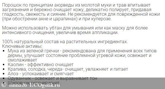 Сам порошок убтана изготовлен по принципам аюрведы из мелкомолотой муки и трав. Он впитывает загрязнения и осторожно очищает кожу, тонко полирует и придает гладкость, бодрость и блеск.