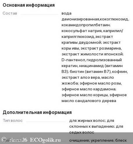 Состав очень полезный и натуральный, созданный самой природой, не содержит вредных веществ и не оставляет липкости и жирности, ощутимо регулируя выработку себума. После его использования кожа головы дышит, а волосы становятся чистыми, объемными и живыми.