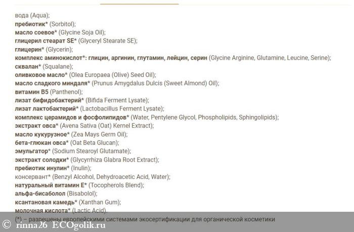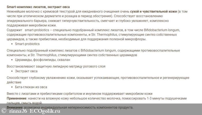 Консистенция изумительная, на задней стороне упаковки есть вся существенная информация, даже на пробнике. Молочко мягко очищает благодаря кремовой текстуре, не повреждая кожу. Для моей возрастной и комбинированной кожи оно хорошо подошло. После применения молочка нет чувства стянутости, жирности, аллергии или дискомфорта. Порадовал комплекс аминокислот, лизаты бифидобактерий, церамиды и лактобактерии, которые входят в молочко вместе с овсянкой, фосфолипидами, оливковым и соевым маслом. Само молочко красивого кремового цвета, средней густоты, с выраженным ароматом овсянки, что ожидаемо.