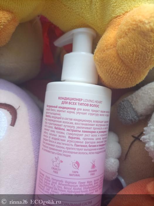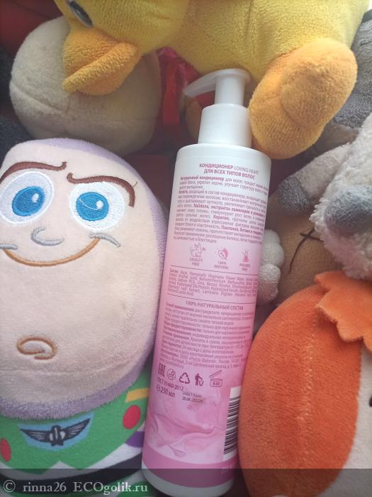 Кондиционер находится во флаконе из плотного пластика, оснащён яркой наклейкой с необходимой информацией по кругу и удобным дозатором, который исправно работает и имеет два положения. При нажатии он подаёт небольшое количество средства. Для применения мне требуется 3-4 нажатия. Кондиционер густой, белого цвета и имеет очень приятную отдушку. Наношу на 5-7 минут в зависимости от того, как много есть времени. Стараюсь выдерживать максимум. Кондиционер довольно густой с пудрово-цветочной отдушкой. Легко распределяется по волосам и никуда не стекает, поэтому его можно использовать в качестве маски. Кондиционер волосы не утяжеляет. Они шелковистые и блестящие, более объемные и отлично расчёсываются, пахнуть вкусно, аромат нежный. Натуральный кондиционер придает волосам блеск, укрепляет корни, улучшает структуру и предотвращает выпадение.