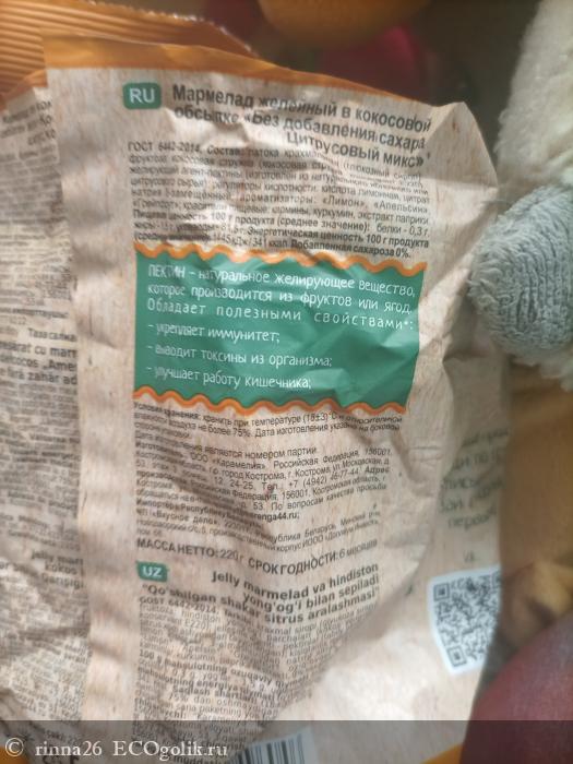 Приветствую всех, заглянувших на страничку! Как настоящая сладкоежка, хочу рассказать о полезной сладости. Поэтому в центре внимания - Мармелад «Меренга» желейный цитрусовый микс в кокосовой обсыпке