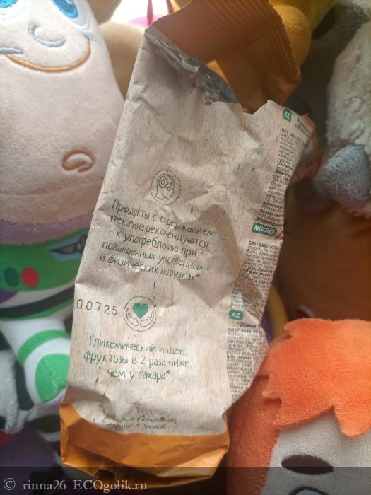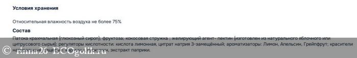 Главными ингредиентами состава является крахмальная патока и фруктоза, в качестве желирующего агента выступает пектин, полученный из натурального сырья. Из минусов - наличие Е220 (диоксид серы - консервант), который занимает ведущие позиции в хит-параде Е.