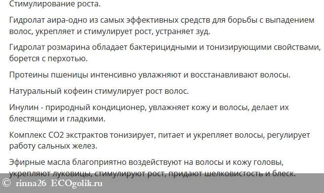 Что меня поразила в первую очередь – состав. Там нет воды, но есть гидролаты, которые служат не только натуральными ароматизаторами и антисептиками, но и положительно влияют на качество волос, останавливая выпадение любой интенсивности. Кроме того, аир избавляет от перхоти и ускоряет рост локонов, благотворно влияет и на жирность волос, делая ее меньше, а частоту мытья волос реже.