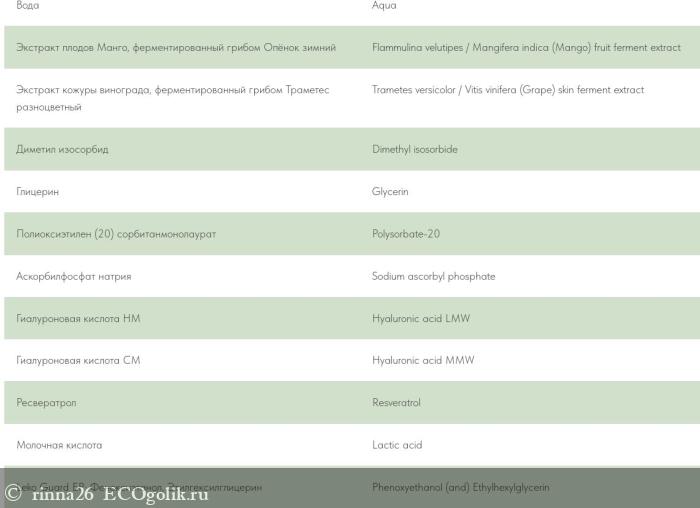 Состав уникальный и содержит экстракт плодов манго, ферментированный грибом опёнком зимним, экстракт кожуры винограда, который ферментирован грибом траметес разноцветный, а так же гиалуроновую и молочную кислоты, реставерол и прочие компоненты.
