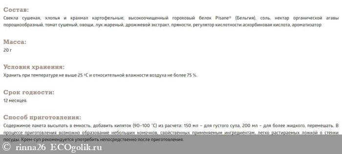 Суп представляет собой порошок с миниатюрными кусочками овощей и специй. Готовиться он легко и отличается сбалансированным составом и вкусом. Продукт без красителей, усилителей вкуса и консервантов, а сытость и густоту ему дают хлопья и крахмал.