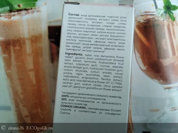 Вода артезианская, гидролат розы дамасской*, глицерин, экстракт семян льна обыкновенного, экстракт плода сливы какаду, смола склероция, стеарат сахарозы, сенегальской акации камедь, мукополисахарид, натрия левулинат, натрия анисат, кокоил пролин, экстракт семян вигнии борцелистной, мальтодекстрин , экстракт анигозантоса, кислота молочная, эфирное масло розы дамасской*, оксид железа красный, кстантановая камедь, цитрат натрия, эфирное масло грейпфрута*, экстракт жасмина* *- ингредиент органического сельского хозяйства 100% натуральных ингредиентов 33% всех ингредиентов из органического сельского хозяйства COSMOSORGANIC, сертифицирован EcoсertGreenlife в соответствии со стандартом Cosmos