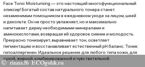 Тоник подходит для любого типа кожа, не стягивает кожу, и не сушит ее, не вызывает шелушения и аллергии. А хороший состав дает результат с первого применения! Кожа гладкая и бархатная. Есть защита от первого вскрытия.