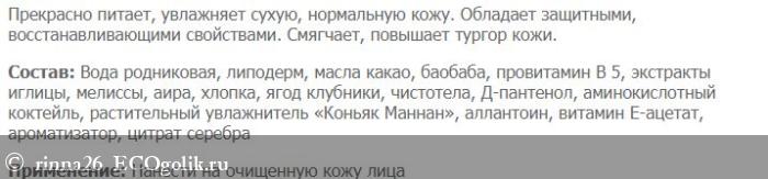 Состав у крема впечатляет, только натуральные компоненты по ГОСТ. Есть витамин Е и провитамин В5, Д-пантенол, а также масло какао и баобаба, растительные экстракты и аминокислоты, цитрат серебра и вегетарианский увлажнитель «Коньяк Маннан».