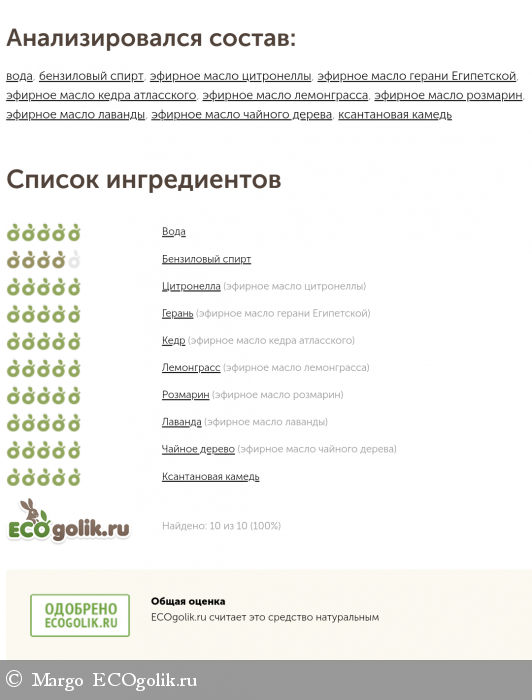 Когда спрей Цитронелла закончился, я поняла, какой же он всетаки классный и незаменимый. Мы собрались поехать в лес, а спрея от комаров нет, новый не купила. Пришлось сделать самой из смеси эфирных масел. Каково же было мое разочарование- мой спрей не работал. Один раз набрызгались и через несколько минут набрызгались еще раз, т.к. мой спрей совсем не работал, хотя эфирки были те, которые не любят комары и мошки. Я использовала три эфирных масла, а состав Цитронеллы намного богаче: вода, бензиловый спирт, эфирное масло цитронеллы, эфирное масло герани Египетской, эфирное масло кедра атласского, эфирное масло лемонграсса, эфирное масло розмарин, эфирное масло лаванды, эфирное масло чайного дерева, ксантановая камедь