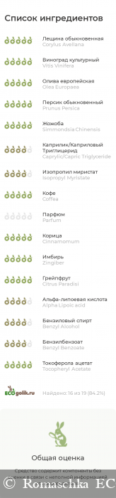 - Повышает упругость, тонизирует, благодаря грамотному сочетанию токоферола с маслами лесного ореха, виноградной косточки, герани и имбиря.