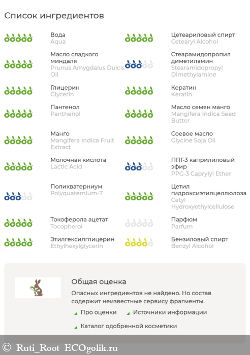 Aqua (Вода), Cetearyl Alcohol (Цетеариловый спирт), Prunus Amygdalus Dulcis Oil (Масло сладкого миндаля), Stearamidopropyl Dimethylamine (Кондиционирующий агент из рапсового масла), Glycerin (Глицерин), Keratin (Кератин), Panthenol (Пантенол), Mangifera Indica Seed Butter (Масло-баттер манго), Mangifera Indica Fruit Extract (Экстракт манго), Glycine Soja Oil (Масло соевое), Lactic Acid (Молочная кислота), PPG-3 Caprylyl Ether (Каприлиловый эфир или «зеленый силикон» / агент, облегчающий расчесывание), Polyquaternium-37, Polyquaternium-7 (Высокомолекулярные катионные кондиционирующие добавки), Cetyl Hydroxyethylcellulose (Целлюлозный загуститель), Tocopherol (Витамин Е), Parfum (Отдушка), Ethylhexylglycerin, Benzyl Alcohol (Этилгексилглицерин, бензиловый спирт / консерванты, разрешённые по стандарту COSMOS для производства органической косметики), Cl75300, Cl75120 (Натуральные красители куркумин и аннато).