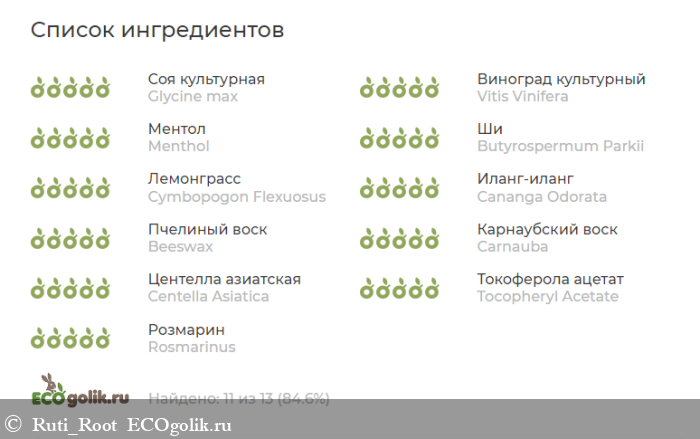 соевый воск, масло виноградной косточки, ментол натуральный, масло ши, эфирные масла камфорного лавра, лемонграсса, иланг-иланга; воски пчелиный и карнаубский; экстракт центеллы азиатской (готу кола), витамин Е, терпены балтийского янтаря, экстракт розмарина.