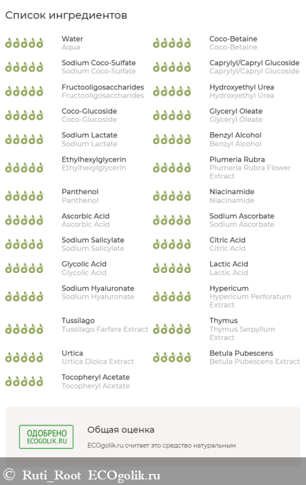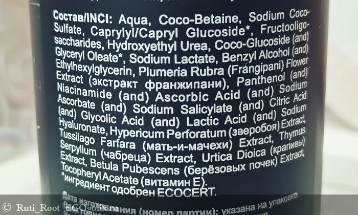 Aqua, Coco-Betaine, Sodium Coco-Sulfate, Caprylyl/Capryl Glucoside*, Fructooligosaccharides, Hydroxyethyl Urea, Coco-Glucoside (and) Glyceryl Oleate*, Sodium Lactate, Benzyl Alcohol (and) Ethylhexylglycerin, Plumeria Rubra (Frangipani) Flower Extract (экстракт франжипани), Panthenol (and) Niacinamide (and) Ascorbic Acid (and) Sodium Ascorbate (and) Sodium Salicylate (and) Citric Acid (and) Glycolic Acid (and) Lactic Acid (and) Sodium Hyaluronate, Hypericum Perforatum (зверобоя) Extract, Tussilago Farfara (мать-и-мачехи) Extract, Thymus Serpyllum (чабреца) Extract, Urtica Dioica (крапивы) Extract, Betula Pubescens (берёзовых почек) Extract, Tocopheryl Acetate (витамин Е).
