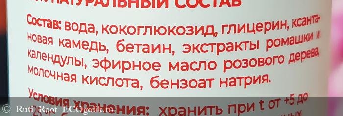 Вода, кокоглюкозид, глицерин, ксантановая камедь, бетаин, экстракты ромашки и календулы, эфирное масло розового дерева, молочная кислота, бензоат натрия.