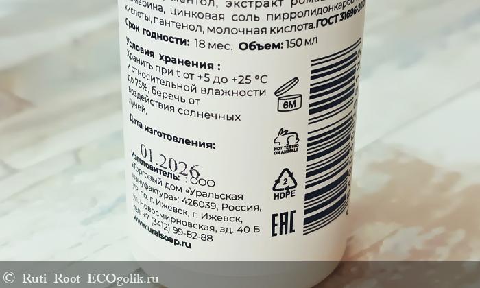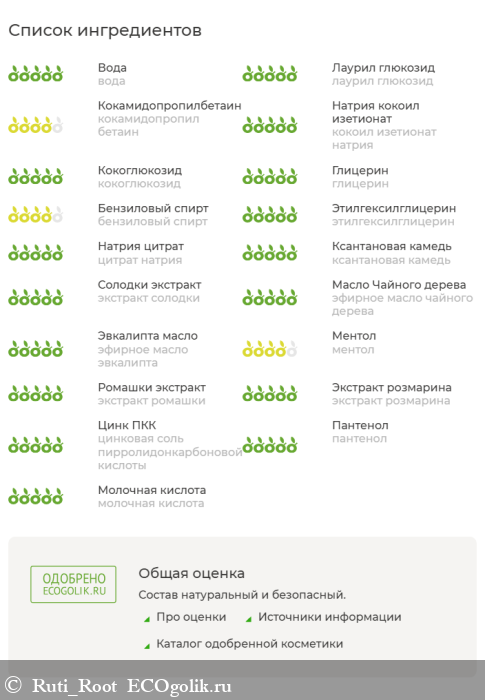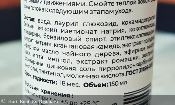 Вода, лаурил глюкозид, кокамидопропил бетаин, кокоил изетионат натрия, кокоглюкозид, глицерин, бензиловый спирт, этилгексилглицерин, цитрат натрия, ксантановая камедь, экстракт солодки, эфирное масло чайного дерева, эфирное масло эвкалипта, ментол, экстракт ромашки, экстракт розмарина, цинковая соль пирролидонкарбоновой кислоты, пантенол, молочная кислота.