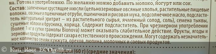 Запеченные хрустящие мюсли (цельнозерновые овсяные хлопья, растительные пищевые волокна, овсяные и пшеничные отруби, пшеничная и рисовая мука, подсолнечное масло, подсластитель натуральный эритрит – из растительного сырья, ячменный солод, соль), семена тыквы, сушеные яблоки и брусника, корица. Содержит подсластитель. При чрезмерном употреблении (более 1 кг в сутки гранолы Bionova) может оказывать слабительное действие. Фрукты, ягоды и зерновые продукты содержат сахара естественного происхождения.