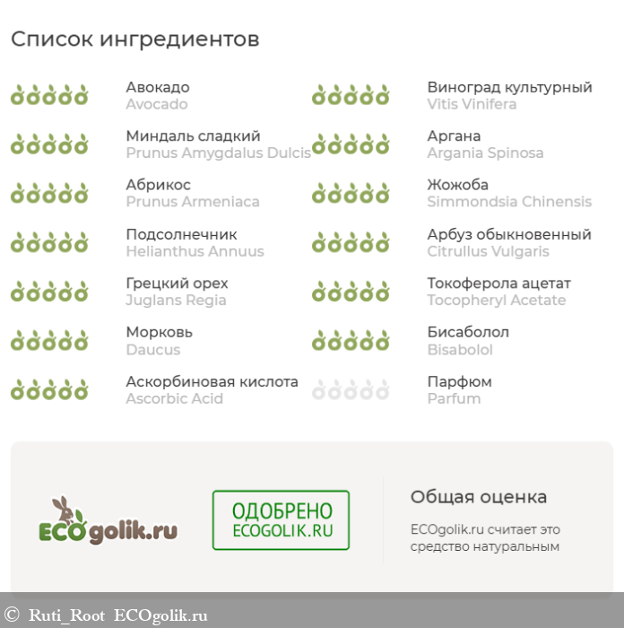 масло авокадо, масло виноградной косточки, масло сладкого миндаля, масло арганы, масло абрикосовых косточек, масло жожоба, масло подсолнечника, масло арбузное, масло грецкого ореха, витамин Е, экстракт моркови, бисаболол, витамин С, парфюмерная композиция.