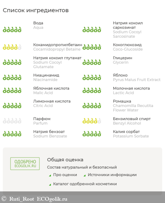 Aqua (Вода), Sodium Cocoyl Sarcosinate (Натрия кокоилсаркозинат), Cocamidopropyl Betaine (Кокамидопропилбетаин), Coco-Glucoside (Кокоглюкозид), Sodium Cocoyl Glutamate (Натрия кокоилглутамат), Glycerin (Глицерин), Niacinamide (Витамин В3), Pyrus Malus Fruit Extract (Экстракт яблока), Malic Acid (Яблочная кислота), Lactic Acid (Молочная кислота), Citric Acid (Лимонная кислота), Chamomilla Recutita Flower Water (Гидролат ромашки), Parfum (Отдушка), Benzyl Alcohol, Sodium Benzoate, Potassium Sorbate (Бензиловый спирт, натрия бензоат, калия сорбат / Консервант, разрешённый по стандарту COSMOS для производства органической косметики).