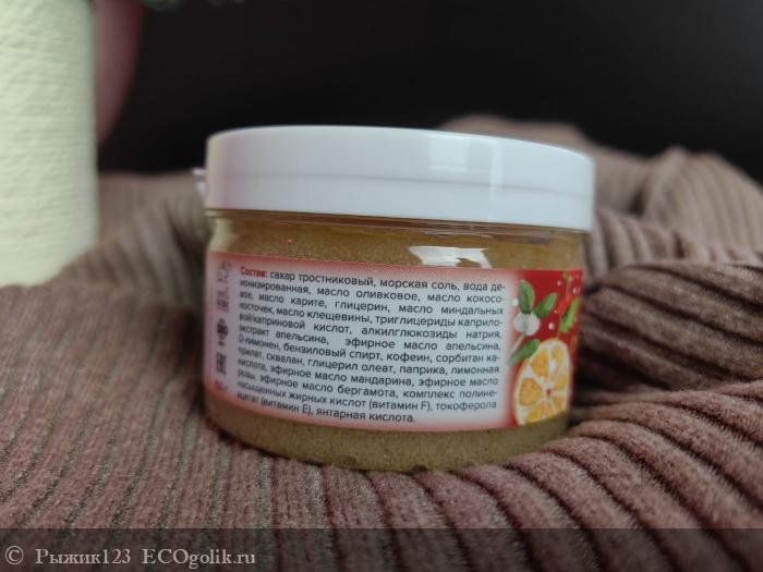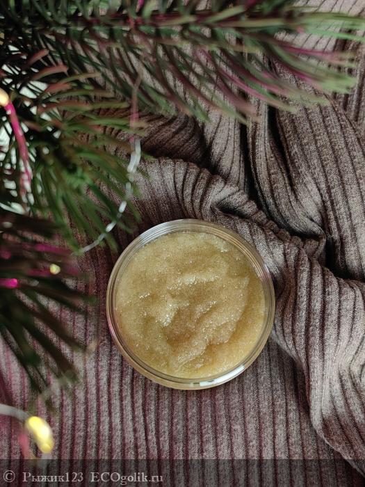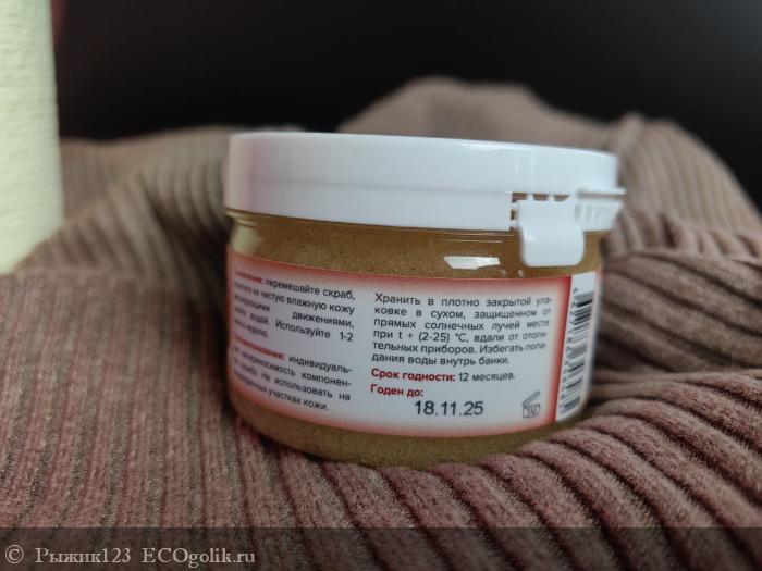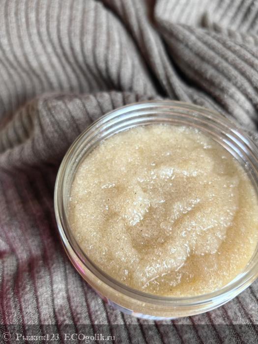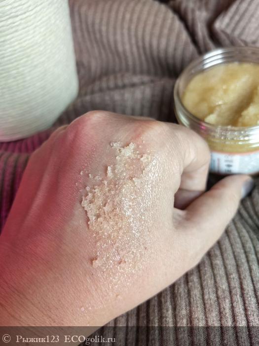 У скраба очень классный аромат, обязательно устраиваю себе и ароматерапию, уткнувшись носом в баночку)) Консистенция хорошая, крупинки достаточно крупные, скрабируют хорошо, но при этом не травмируют кожу. А ещё он не сухой и не осыпается.