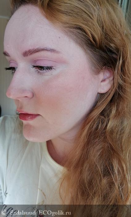 А вот я уже донанесла макияж и распылила сверху спрей. Все выглядит также матово, но более однородно и живенько.